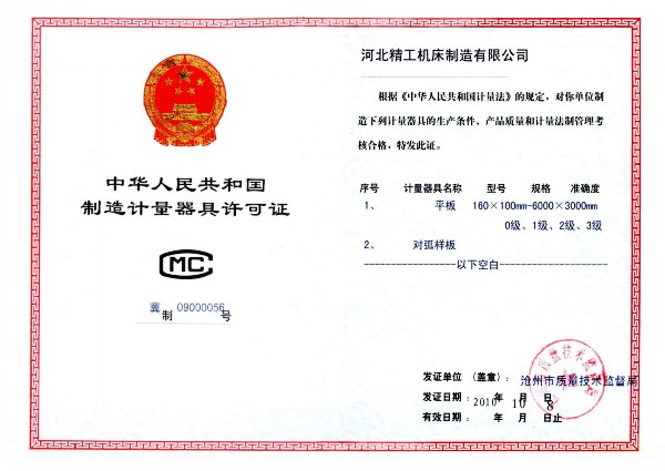 河北精工機(jī)床制造有限公司計(jì)量器具生產(chǎn)許可證