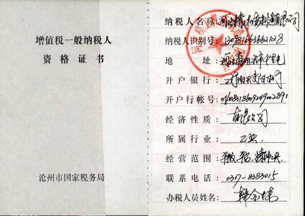 河北精工機(jī)床制造有限公司一般納稅人資格證書