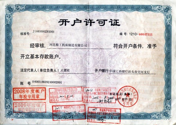 河北精工機(jī)床制造有限公司開戶許可證