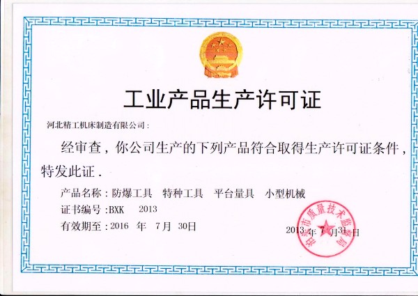 河北精工機(jī)床制造有限公司工業(yè)產(chǎn)品生產(chǎn)許可證