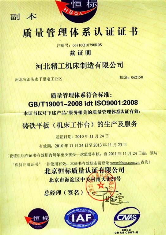 河北精工機(jī)床制造有限公司ISO9001:2008